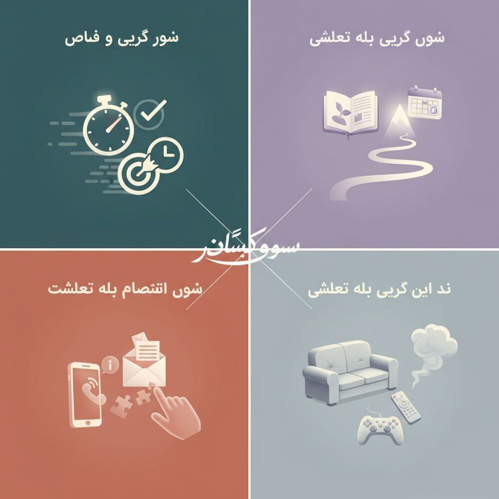 - کارهای نه فوری و نه مهم (خانه چهارم): کارهایی که بیشتر وقت تلف کردن هستند و بهتر است حداقل ممکن از آنها انجام شود یا حذف شوند.
