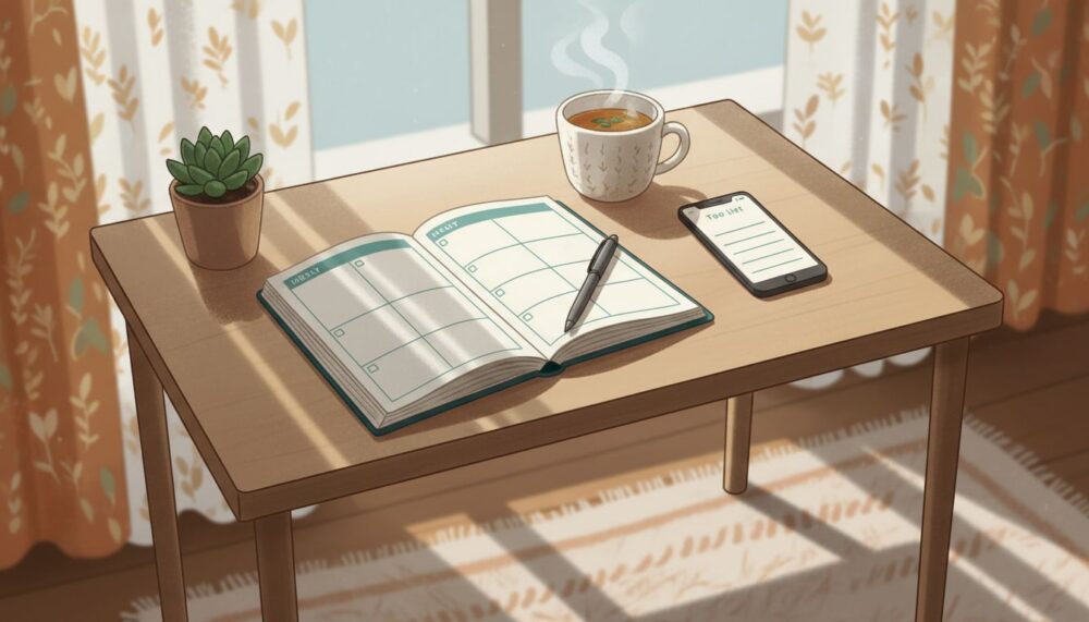 - یک «نقشه هفته» با سه ستون: کارهای سنگین، پیگیریها، امور شخصی.